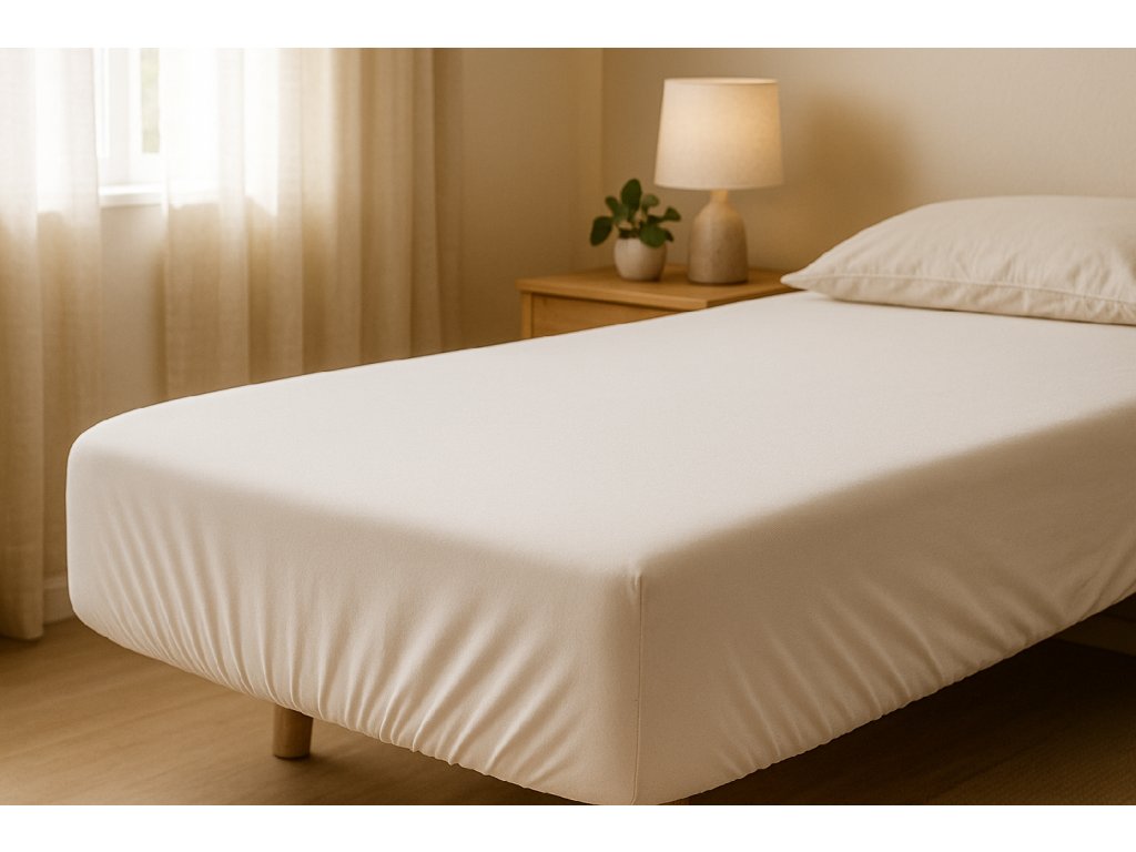Univerzální napínací prostěradlo 90×200 cm, bílé barvy, vhodné pro matrace o výšce 12–15 cm. Pohodlné, prodyšné a snadno udržovatelné.